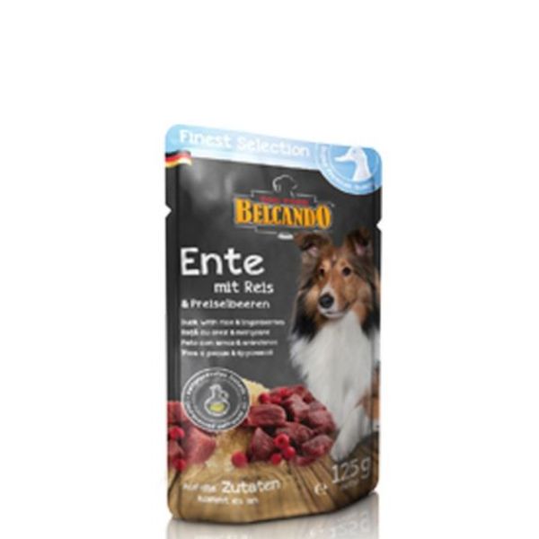 BELCANDO® Ente Pouch es un alimento húmedo para perros formulado con pato de alta calidad con arroz y arándanos. Jugosa carne mejorada con delicados ingredientes y presentada en bolsitas individuales. El aceite de cardo prensado en frío aporta ácidos grasos esenciales no saturados. Extraordinariamente sabrosa y de muy fácil digestión, la comida BELCANDO® Finest Selection es ideal para perros sensibles o exigentes.