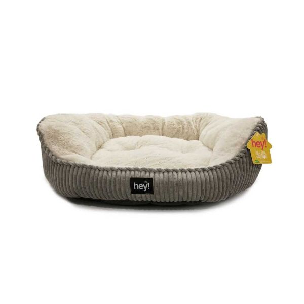 Cama redonda beige diseñada con un acogedor forro de piel sintética contra el que la mascota le encantará acurrucarse, con un diseño moderno que complementará la estética de cualquier hogar.