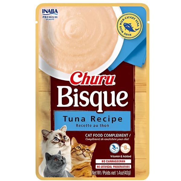 Churu Bisque Atún de Inaba es un snack premium especialmente diseñado para complementar la alimentación de tu gato. Con ingredientes 100% naturales, es el complemento ideal para añadir humedad y sabor a su comida seca diaria, ayudando a mantener a tu felino hidratado y satisfecho.