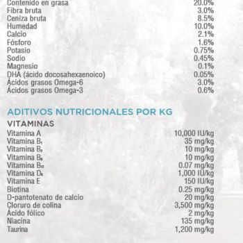 Harina de pollo (59%), arroz blanco molido (23%), grasa de pollo (conservada con tocoferoles mixtos), aroma natural, semillas de lino, celulosa en polvo, aceite de salmón (fuente de DHA), cloruro potásico, raíces de achicoria deshidratadas, col rizada, semillas de chía, calabaza, arándanos, naranjas, quinoa, algas deshidratadas, coco, espinacas, zanahorias, papaya, extracto de Yucca schidigera.