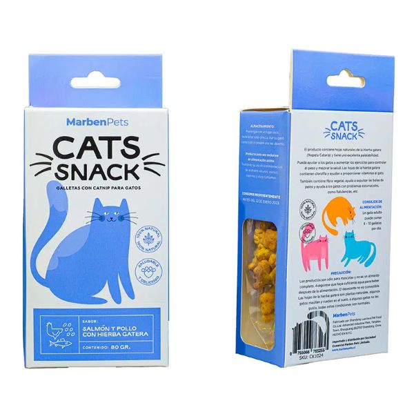 Las Galletas de Salmón y pollo con hierba gatera 80g – Cats Snacks es un delicioso snack que estimula la actividad física ayudando a controlar el peso y mejora la salud de tu gato. Las Galletas de Salmón y pollo con hierba gatera 80g – Cats Snacks están elaborado con productos 100% naturales y con mucho sabor. Son altamente sabrosas y saludables. Estas deliciosas galletas contienen hojas naturales de catnip y tiene una excelente palatabilidad. Puede ayudar a los gastos a aumentar los ejercicios para controlar el peso y mejorar la salud. Las hojas de hierba gatera contienen clorofila y ayudan a proporcionar vitaminas a los gatos. También contiene fibra vegetal, contribuye a expulsar las bolas de pelo y ayudar a los gatos con problemas estomacales como flatulencia, etc.