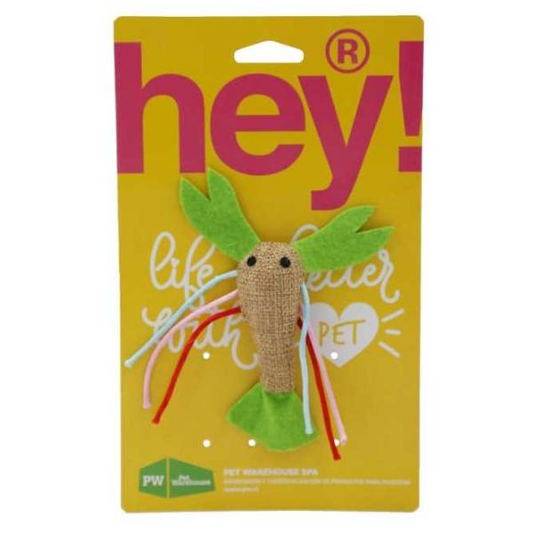 El juguete para gatos Langosta de hey! tiene un diseño bastante dulce y veraniego con cintas de colores para que tu gato sienta el espíritu de la temporada. La cubierta es de arpillera estampada y pañolenci. Es ideal para arañar, batear y morder, y para mantener a su gato cautivado en el tiempo de juego. Es ideal para los gatos a los que les encanta golpear sus juguetes mientras juegan.