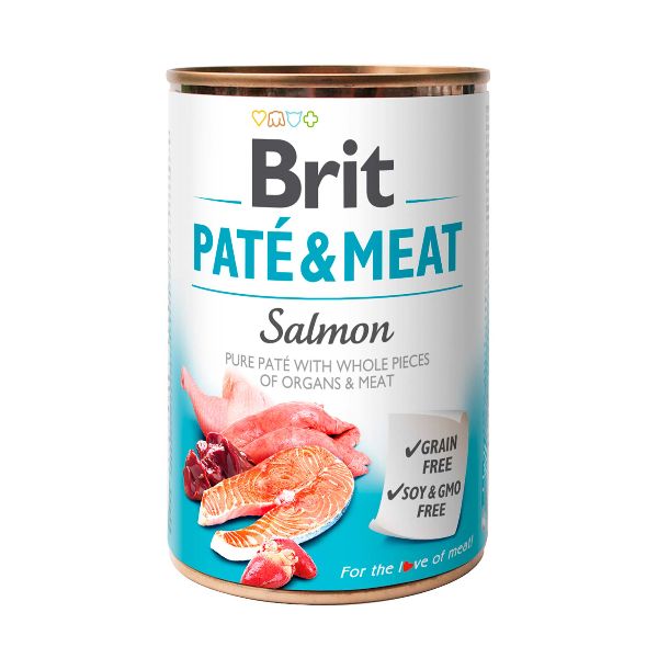 Brit Paté & Meat Salmón es un alimento húmedo completo indicado para perros adultos. Formulado con 70% de pollo y salmón + paté puro de carne. Enriquecido con aceite de salmón como fuente de Omega 3.  Libre de soya, GMO y gluten.