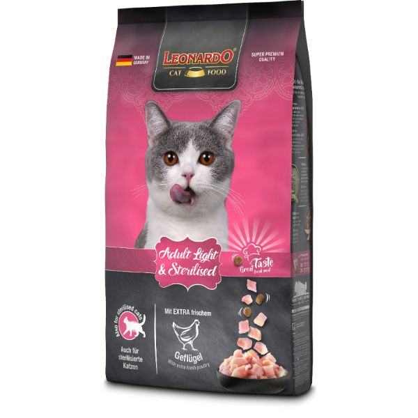 Leonardo Adult Light de LEONARDO® Es un alimento para gatos adultos con sobrepeso o con tendencia a subir de peso. El exceso de peso puede ser por muchas causas, ya sea debido a una alimentación incorrecta por demasiadas golosinas o a la presencia de hormonas tras una castración, en ambos casos se reduce el nivel de actividad y aumenta enormemente el riesgo de padecer enfermedades. Por consiguiente, la adaptación temprana de la alimentación mediante un alimento para gatos de bajo contenido energético, favorece en gran medida la salud del gato y le ayuda a recuperar la forma.
