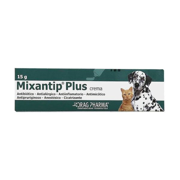 Mixantip Plus crema 15 gr, ayuda en el tratamiento de infecciones bacterianas y micóticas, inflamaciones dolorosas y difusas de la piel y prurito en animales de compañía. Dermatitis, eczemas, piodermas y escoriaciones. Cirugías estéticas (corte de cola, corte de orejas).