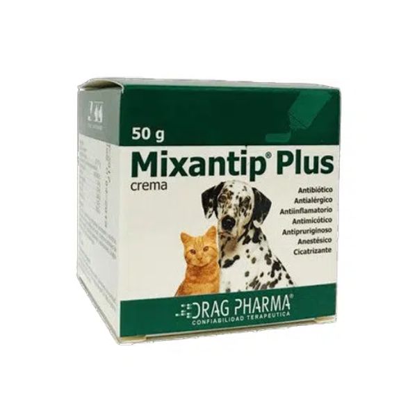 El Mixantip Plus 50gr es un antibiotico, antialérgico, antinflamatorio, antimicótico, antipruriginoso, anestésico y cicatrizante que ayuda en el tratamiento de infecciones bacterianas y micóticas, inflamaciones dolorosas y difusas de la piel y prurito en animales de compañía. De igual forma igua a la dermatitis, eczeemas, piodermas, excoriaciones y cirugías estéticas (corte de cola, corte de orejas).