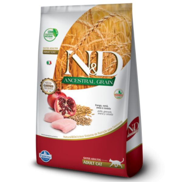 N&D Ancestral feline frango Adult esta hecho con carne de pollo, cereales ancestrales de bajo índice glicemico, enriquecido con frutas , legumbres, y una adición de esencias botánicas. Composición carne de pollo (mecanicamente separada), harina de vísceras de aves (mín. 10%), huevo en polvo, harina de pescado, harina de torrezno, granos de sorgo, avena (mín. 0,5%), cebada en grano (mín. 0,5%), aceite de pollo, aceite de pescado, pulpa de remolacha, cáscara de guisante, alfalfa deshidratada, lignocelulosa, semilla de psyllium, levadura seca de cervecería, zanahoria deshidratada, espinaca deshidratada, naranja deshidratada, manzana deshidratada, extracto de arándano, extracto de granada (mín. 0,08%), extracto de té verde, extracto de aloe vera, cúrcuma em polvo, beta caroteno, aditivos prebióticos (FOS y MOS), DL-metionina, taurina, L-carnitina, sulfato de condroitina, sulfato de glucosamina, aditivos adsorbentes (extracto de yucca y zeolita), hidrolizado de hígado de aves y cerdos, vitaminas (retinol (A), colecalciferol (D3), acetato de DL-alfa-tocoferol (E), tiamina (B1), riboflavina (B2), clorhidrato de piridoxina (B6), cianocobalamina (B12), ácido ascórbico monofosfato (C), biotina, niacina, ácido pantoténico, ácido fólico, cloruro de colina), fosfato bicálcico, ácido fosfórico, carbonato de calcio, cloruro de potasio, hierro aminoácido quelato, cobre aminoácido quelato, zinc aminoácido quelato, manganeso aminoácido quelato, proteinato de selenio, yodato de calcio, propionato de calcio, concentrado de tocoferoles. Humedad (máx.) 9%; Proteína Bruta (mín.) 36%; Extracto Etéreo (mín.) 20%; Materia Fibrosa (máx.) 1,9%; Materia Mineral (máx.) 8,1%; Calcio (mín.) 0,8%; Calcio (máx.) 1,4%; Fósforo (mín.) 0,8%; Sodio (mín.) 2.000mg/kg; Potasio (mín.) 5.000mg/kg; Magnesio (mín.) 900mg/kg; Omega 6 (mín.) 25g/kg; Omega 3 (mín.) 2.900mg/kg; DHA (mín.) 870mg/kg; EPA (mín.) 675mg/kg; Betacaroteno (mín.) 1,5mg/kg; Fructo-Oligosacáridos (mín.) 400mg/kg; Manano-Oligosacáridos (mín.) 240mg/kg; Metionina (mín.) 7.500mg/kg; Taurina (mín.) 2.000mg/kg; L-Carnitina (mín.) 100mg/kg; Lisina (mín.) 14g/kg; Sulfato de Condroitina (mín.) 200mg/kg; Sulfato de Glucosamina (mín.) 300mg/kg; E. Metabolizable (mín.) 4.165 kcal/kg