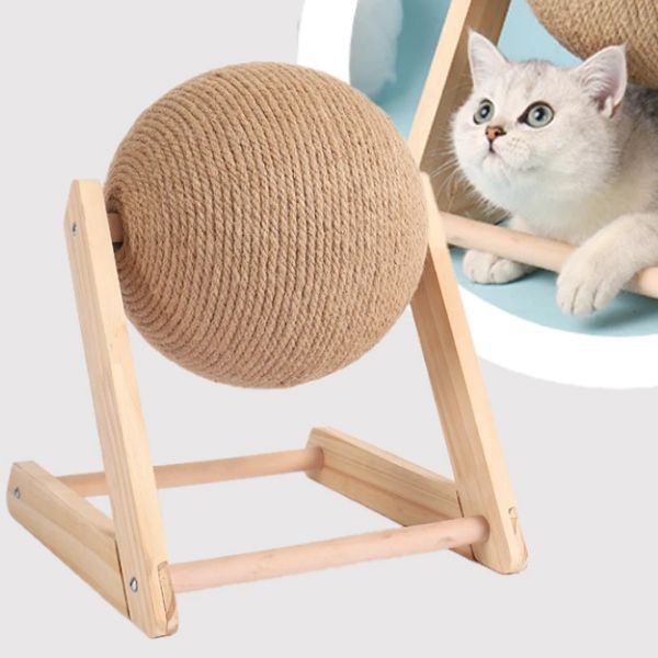 Bola rascadora de gato, hecha de madera maciza y material de cuerda de sisal, es fuerte y duradera. Se adapta a la mayoría de los gatos y gatitos, está cuidadosamente diseñado de acuerdo con los hábitos diarios de gato, práctico, ahorro de espacio, pequeño y compacto. Atrae la atención del gato, puede moler fácilmente sus patas para evitar que rayen el suelo, sofá, cojines y muebles, satisface el instinto natural de rascador del gato, aumenta el ejercicio y la diversión. La base del marco de triángulo está diseñado para apoyar la bola de sisal, que es difícil de verter, de modo que los gatos no pueden ser lastimados al jugar con este juguete. De madera natural, simple, elegante se puede integrar con el estilo moderno de los muebles de la familia.