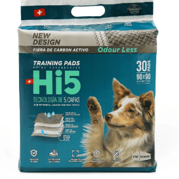 Los nuevas sabanillas Hi5 de carbón activo están fabricados con una tecnología ultra-absorbente de 5 capas de protección para bloquear la humedad y resistente a prueba de fugas para evitar que la humedad llegue al suelo. Cada sabanilla tiene 5 gr. de gel y absorbe 550 ml de agua y 350 ml de solución salina.