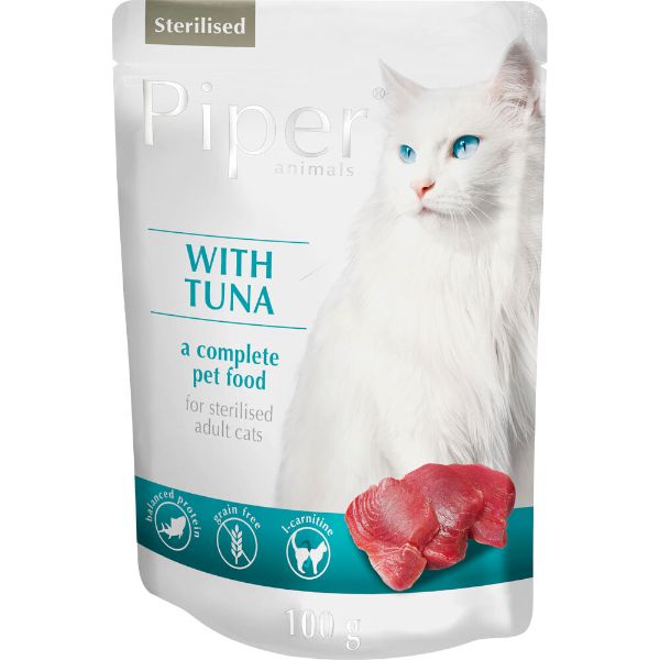 Alimento húmedo completo para gatos. Piper Cat Atún es un alimento completo húmedo libre de granos, soya, gluten, sin saborizantes ni colorantes artificiales, formulado para gatos adultos esterilizados de todas las razas. Su presentación es Pouch de 100 gr.