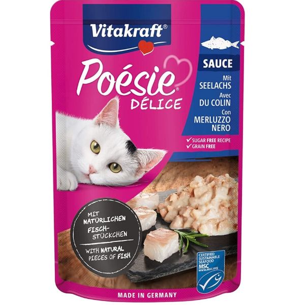 Vitakraft Cat Poésie Delice Pescado es un alimento húmedo para gatos envasado en una bolsita de calidad premium. Deliciosa receta de exquisito abadejo en salsa. Su alta calidad, su deliciosa salsa y su fácil reconocimiento de ingredientes, lo hacen muy apetitoso. Con ingredientes adaptados a las necesidades nutricionales de su gato, sin azúcar ni conservantes, ni colorantes.