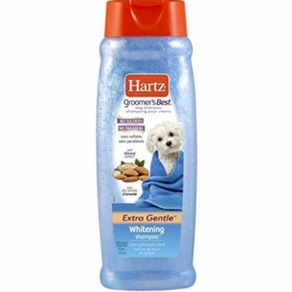 Groomer’s Best Whitening Shampoo de Hartz para perros saca el brillo natural del pelo blanco, plateado o claros y reduce la decoloración. Limpia profundamente para un brillo saludable. Olor a cerezo.