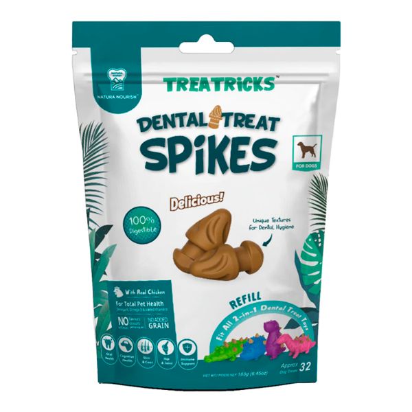 El Snack Dental Treats Spikes Refill – Pollo indicado para perritos que brindan ayuda con la limpieza dental de sus dientes y mal aliento, pero a la misma vez lo premias por una buena acción y consientes gracias a su sabroso sabor a pollo. Estos snacks son 100% libre granos, son fáciles de digerir y su forma ayuda a reducir la formación de sarro y placa.