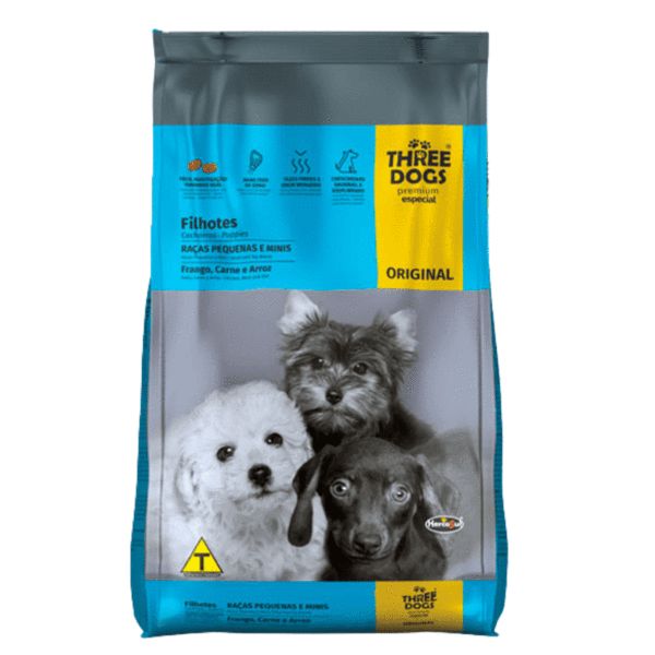 Three Dogs Premium Especial Original Cachorros de Razas Pequeñas y Minis es un alimento moderno y seguro, libre de colorantes y aromatizantes artificiales que presenta un óptimo costo beneficio. Su receta es rica en ingredientes de alta calidad que proporcionan proteínas, energía, vitaminas y minerales balanceados. Three Dogs Premium Especial Original Cachorros de razas Pequeñas y Mini también es indicado para hembras a partir de la sexta semana de gestación hasta el destete total de los cachorros.