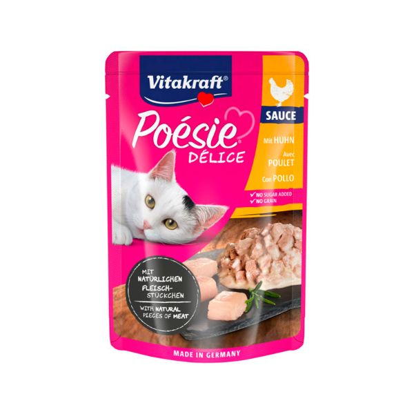 Vitakraft Poésie Délice Pollo ofrece una experiencia gourmet para tu felino favorito. Estas bolsitas contienen exquisitos bocaditos acompañados de una delicada salsa, elaborados con los más finos ingredientes naturales Premium, garantizando una alimentación óptima para tu gato.
