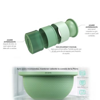 Zee.Bowl Patrol es un tazón para comida ajustable para ofrecer a su perro una mejor forma de alimentación. Al ser ajustable en altura (de 15  a 30 cm) su perro adoptará una postura más cómoda para comer. Base antideslizante. Tazón superior desmontable y apto para calentar en micro-ondas y ofrecer la comida caliente a su perro. Provisto también de alimentador lento. Disponible en color verde.